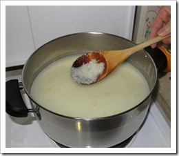 Μόλις πάρουν βράση, ρίχνουμε το ρύζι, τις βανίλιες και τη μαστίχα, που έχουμε πρώτα κοπανήσει στο γουδί μαζί με λίγη ζάχαρη.