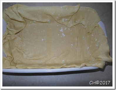 Λαδώνουμε ένα παραλληλόγραμμο πυρίμαχο σκεύος, πασπαλίζουμε με 1 κουταλιά φρυγανιά και στρώνουμε το ένα φύλλο ζύμης καλύπτοντας και τα τοιχώματα.