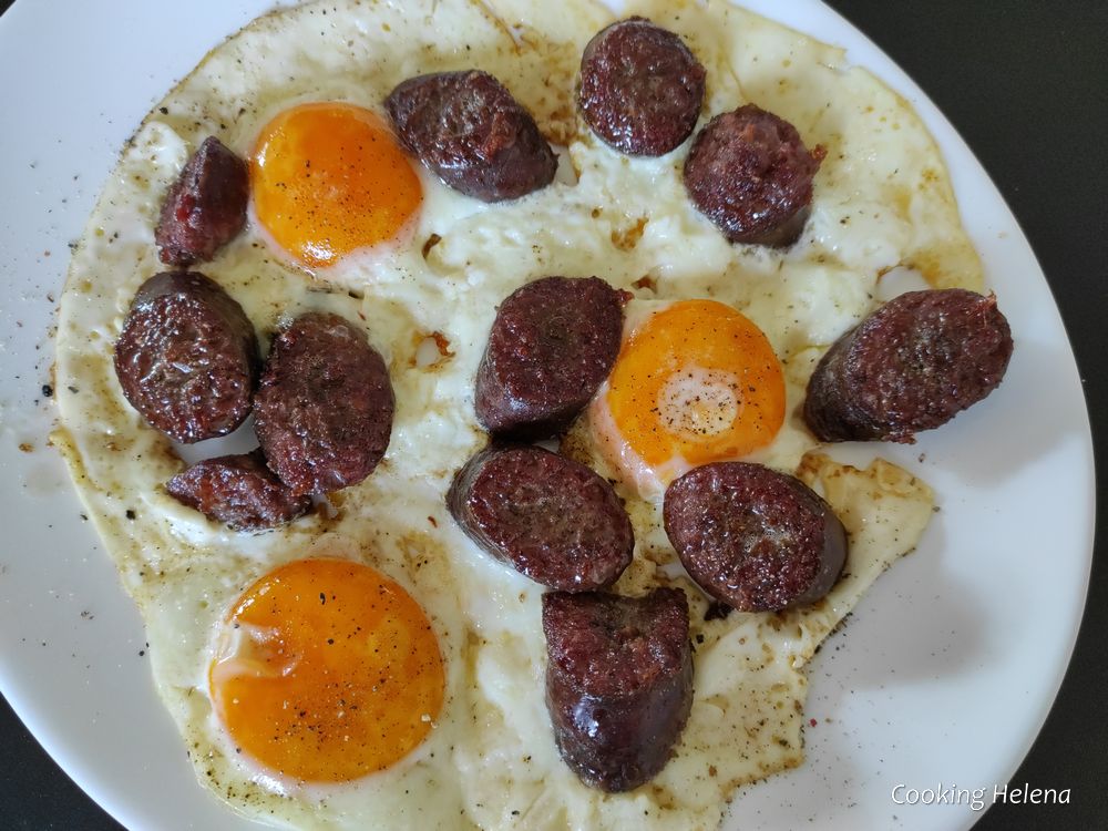 ψυγείο πήρα τέσσερα αυγά και σουτζούκι Καισαρείας. Έστρωσα στο τηγάνι μερικές φέτες