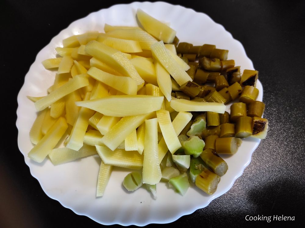 Καθαρίζουμε την πατάτα και την κόβουμε σε λεπτά μπαστουνάκια.